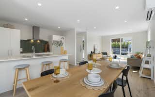 The open-plan layout, enhanced by high stud ceilings, creates a spacious, light-filled environment that is both welcoming and functional. The light and spacious kitchen, thoughtfully designed for seamless access to the lounge, dining, and outdoor areas, serves as the central hub for entertaining, from here you can step out to the sunlit outdoor area, ideal for hosting friends and family.