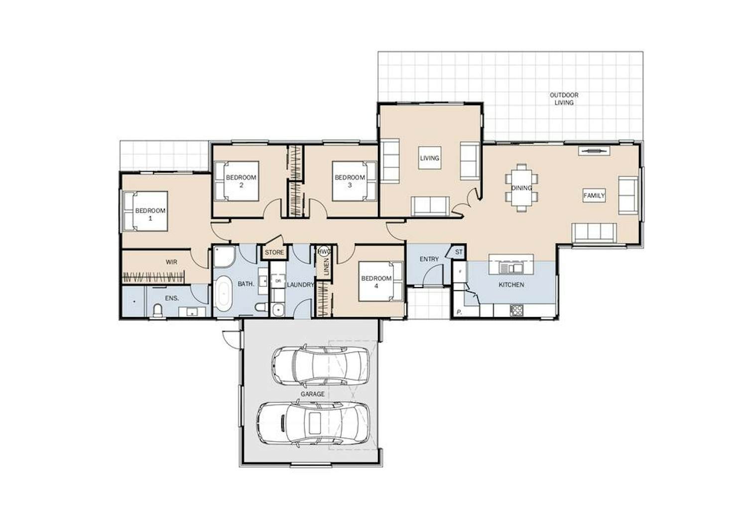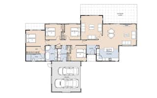 This section has been perfectly paired with the Traveller plan, offering modern family living at its finest and top-tier specifications for both the home's exterior and interior. The Traveller plan is ideal for homeowners who value both comfort and style. Upon entering, you'll find a welcoming foyer that leads to a seamless flow of open-plan living with a contemporary kitchen, perfect for family gatherings and entertaining. The large sliders create a smooth indoor-outdoor connection, leading to a beautiful outdoor dining area, ideal for enjoying meals in the fresh coastal air. Featuring four spacious double bedrooms and two bathrooms, including an ensuite, the Traveller plan offers plenty of space for relaxation.
